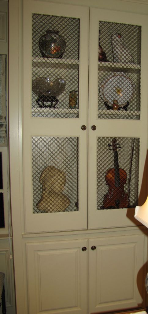 Here, we simply added a pair of doors to the top section with some gorgeous antique brass French open-work wire inset. See how much nicer a flush line of cabinetry looks? How much cleaner the visual line running ceiling to floor looks?