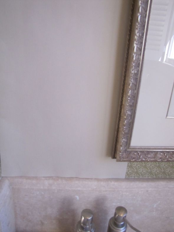 Here is the actual Sea Haze sample I used in the kitchen consultation. Notice how the color of the large sample brings out the rich greeny grays of the existing granite countertop. That is what the right color does in a room. It creates visual harmony. Remember that, because it is one of the most important things that will happen when you paint the right color on your walls. The right color creates visual harmony.