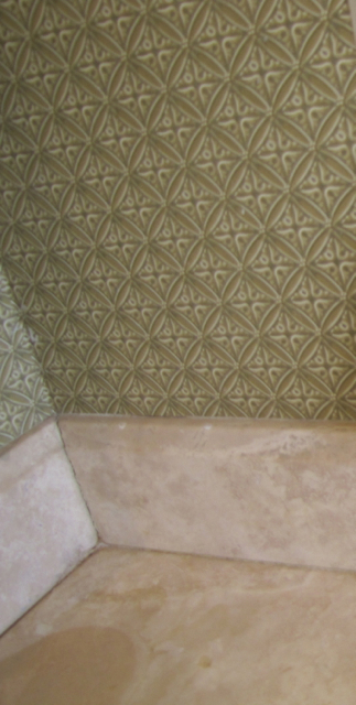 Can you notice that the pink undertone in the travertine is looking much less pink, now that Rusty Green is gone? Compare the before with the ‘during’: