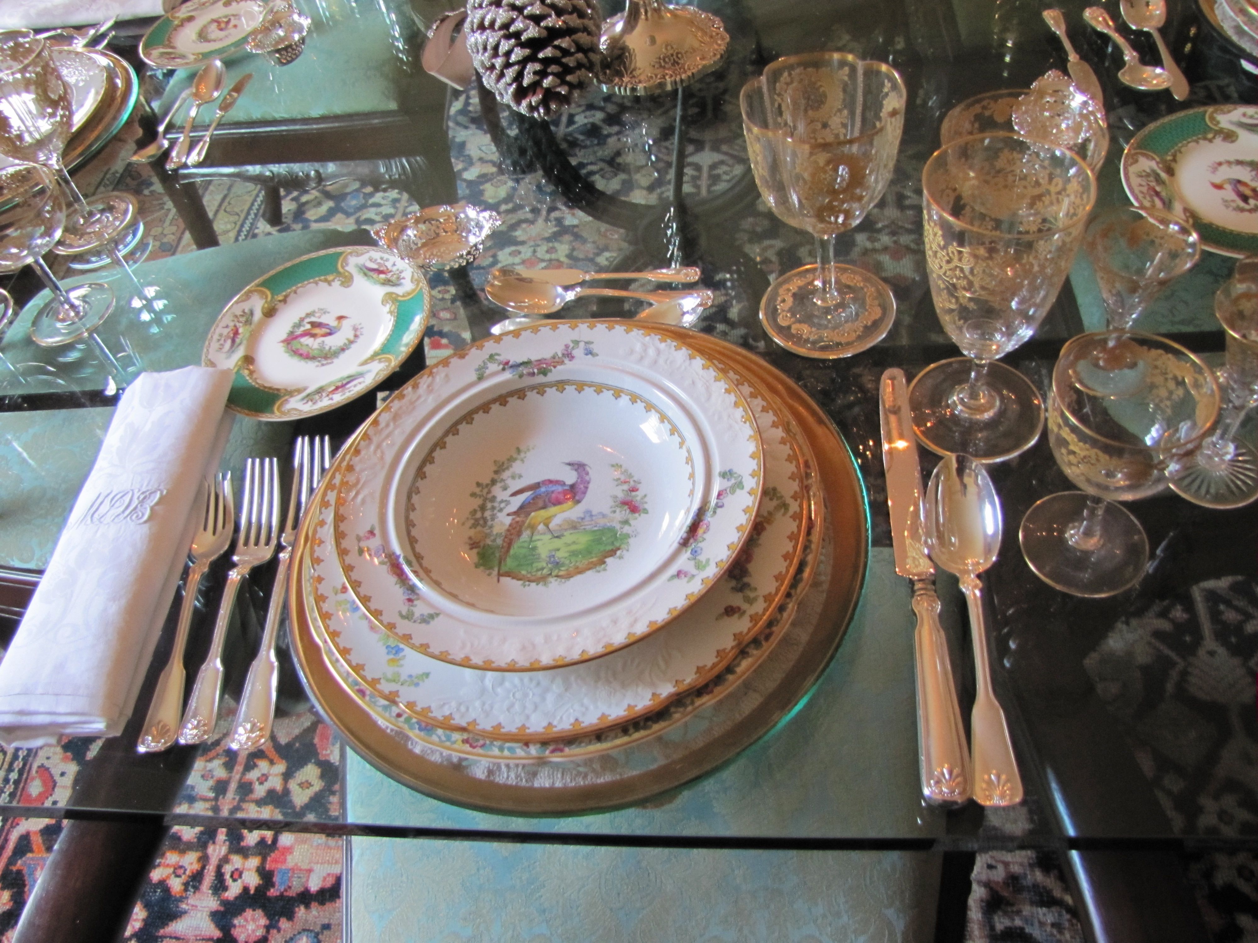 (The dining table looks straight out of Downton Abbey, with six gold-and-crystal Art Nouveau goblets per place setting!)