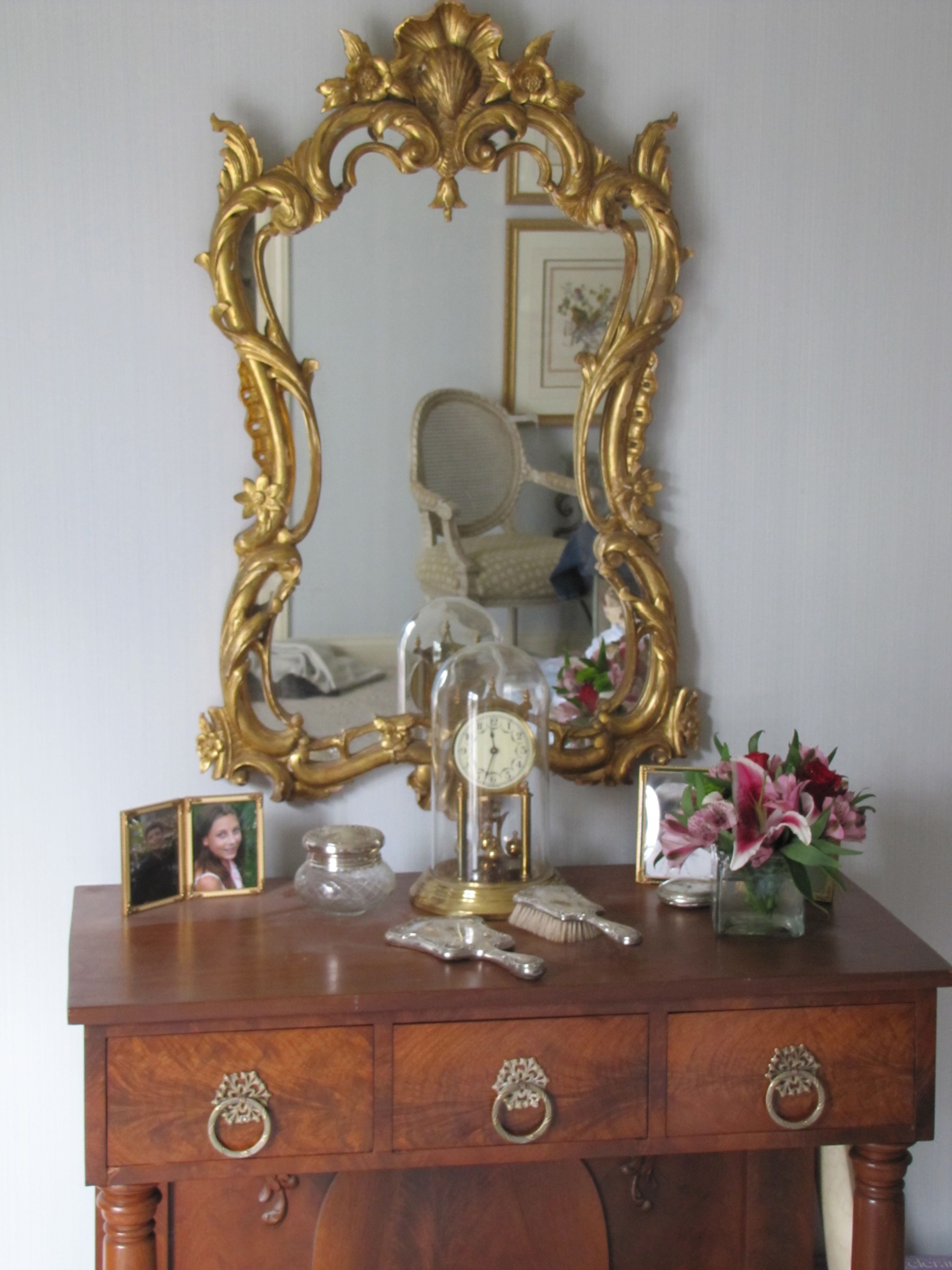 Above: A hand-carved water gilt mirror, hung at dressing table height
